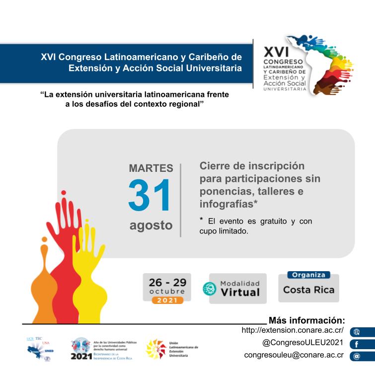 El XVI Congreso Latinoamericano y Caribeño de Extensión y Acción Social Universitaria, que celebrará Costa Rica del 26 al 29 de octubre del 2021, cerrará el proceso de inscripción para participantes sin ponencias, talleres o infografías el próximo 31 de agosto. Recuerde que la actividad es gratuita y se realizará por primera vez bajo la modalidad virtual debido a las actuales condiciones sanitarias en el mundo.