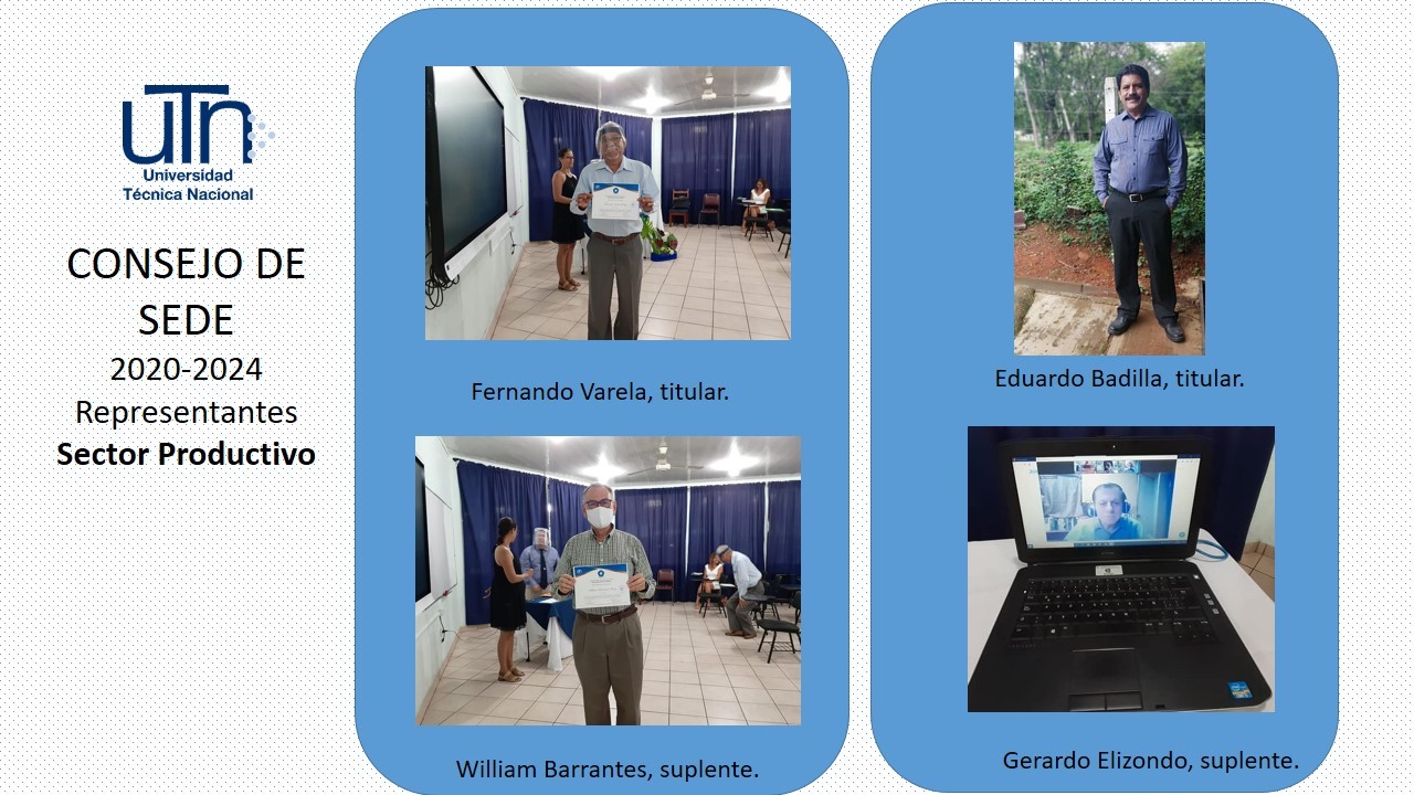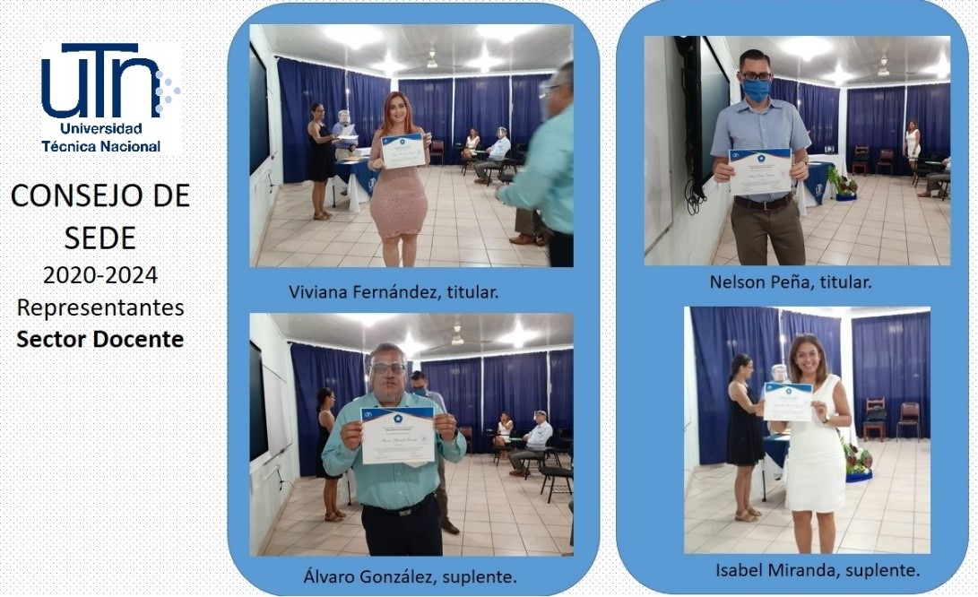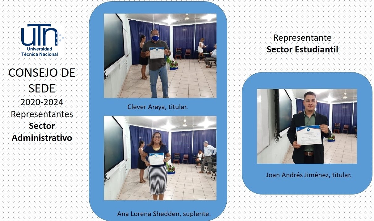Los juramentados de forma presencial fueron Viviana Fernández Viscaíno, titular del Sector Docente y Álvaro González Alvarado como suplente de Fernández, Nelson Peña Navarro, titular del Sector Docente e Isabel Miranda González como suplente de Peña, Clever Araya Villalobos titular del Sector Administrativo y Ana Lorena Shedden Quirós como suplente de Araya, Fernando Varela Zúñiga, titular del Sector Productivo y William Barrantes Sáenz suplente de Varela. De forma virtual fueron juramentados Eduardo Badilla Loría como titular del Sector Productivo y Gerardo Elizondo Aguilar suplente de Badilla, ambos presentaron situaciones de salud que les impidió presentarse en el acto; estos miembros forman parte del CS por cuatro años. También fue juramentado Joan Andrés Jiménez, representante del sector estudiantil quien forma parte de este CS por un año.