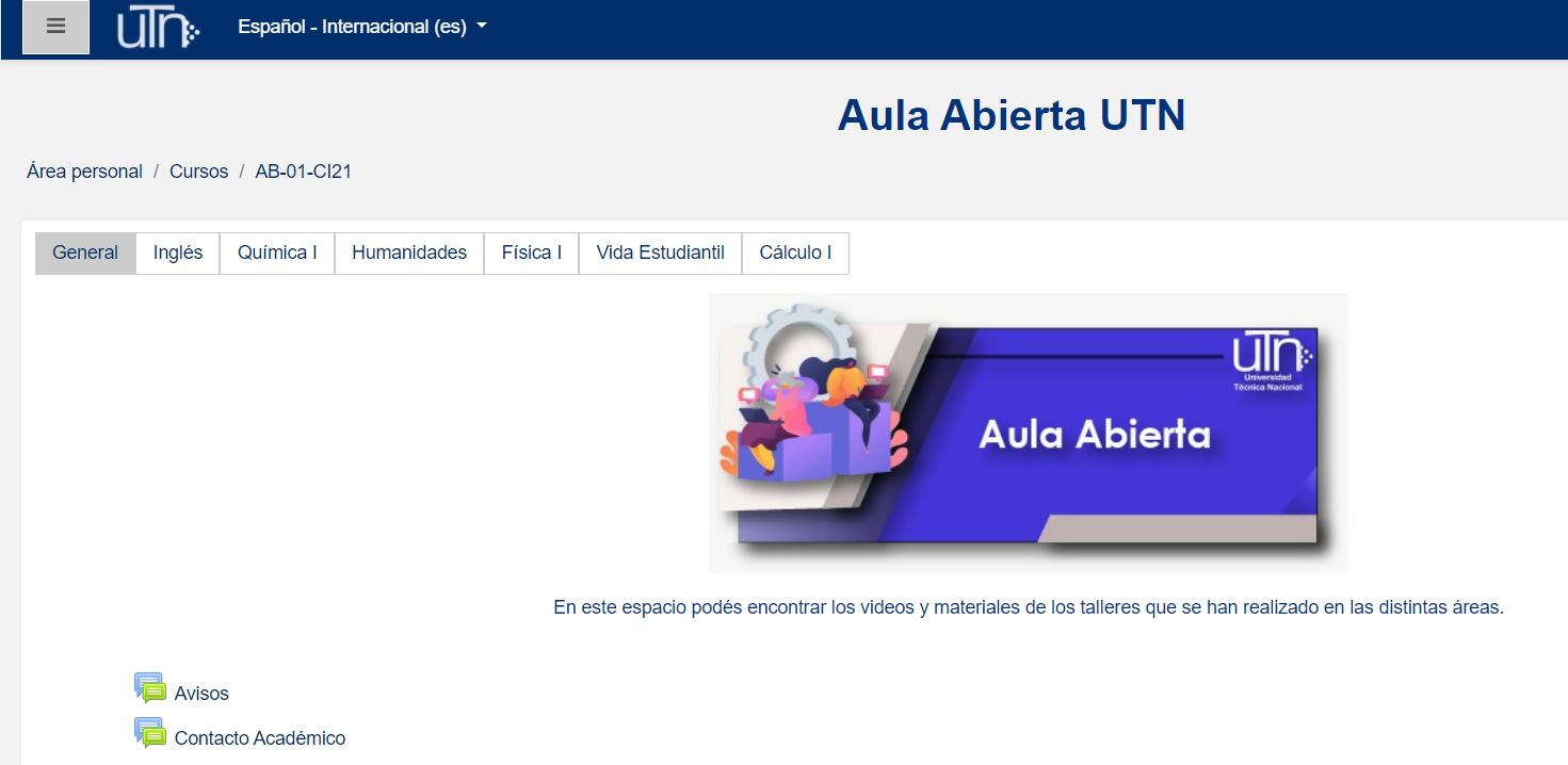 Al ingresar al Campus Virtual de la Universidad, específicamente al Aula Abierta UTN (Enlace) , las personas estudiantes pueden acceder a recursos educativos digitales como vídeos de los talleres realizados categorizados por temas, vídeos de preparación para exámenes de Química I, Física I y Cálculo I, materiales didácticos para el estudio de temas específicos, y a partir del primer cuatrimestre 2022, cursos autogestionados con tutoriales, animaciones, vídeos, masterclass, evaluaciones con calificación automática y folletos de prácticas.