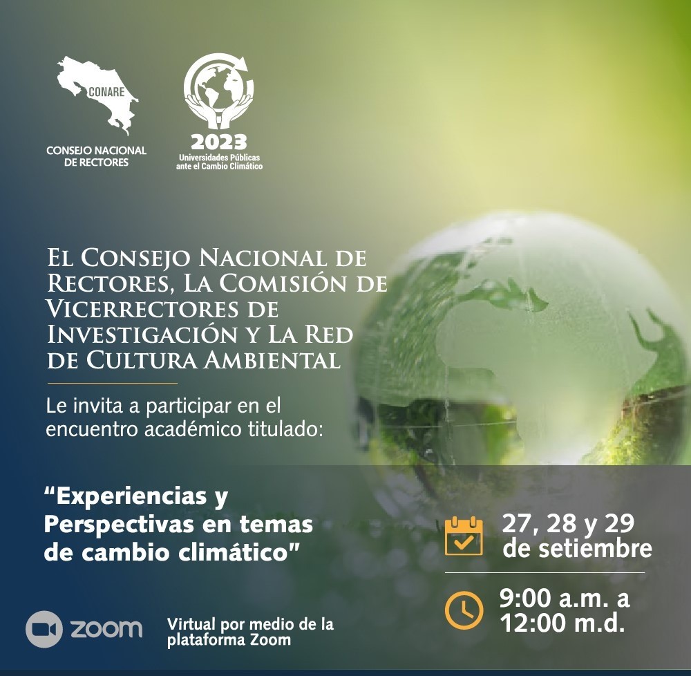 El CONARE, realizará los días 27, 28 y 29 de setiembre del 2023, el Encuentro Académico Virtual Experiencias y Perspectivas en temas de Cambio Climático, el cual tiene como objetivo analizar experiencias universitarias de docencia, investigación, gestión, extensión o acción social que aporten soluciones y formas distintas de afrontar de manera sostenible el reto global que representa el cambio climático y al que se enfrentan los seres vivos y los espacios naturales del Planeta.