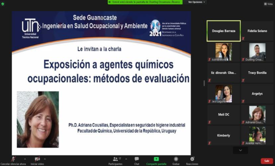 El 10 de marzo la Carrera de Ingeniería en Salud Ocupacional (ISOA) de la Sede de Guanacaste se fortaleció con una charla virtual impartida por una Investigadora de la Universidad de la Republica de Montevideo, Uruguay.