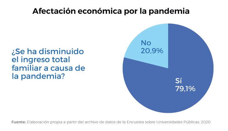 Según la encuesta, el 79,1 % de las personas consultadas reconoció una disminución en los ingresos familiares como resultado de la actual pandemia. En el 42,3 % de los casos, tal afectación representó más de la mitad de los recursos que percibían y en el 17,1 % significó la totalidad.