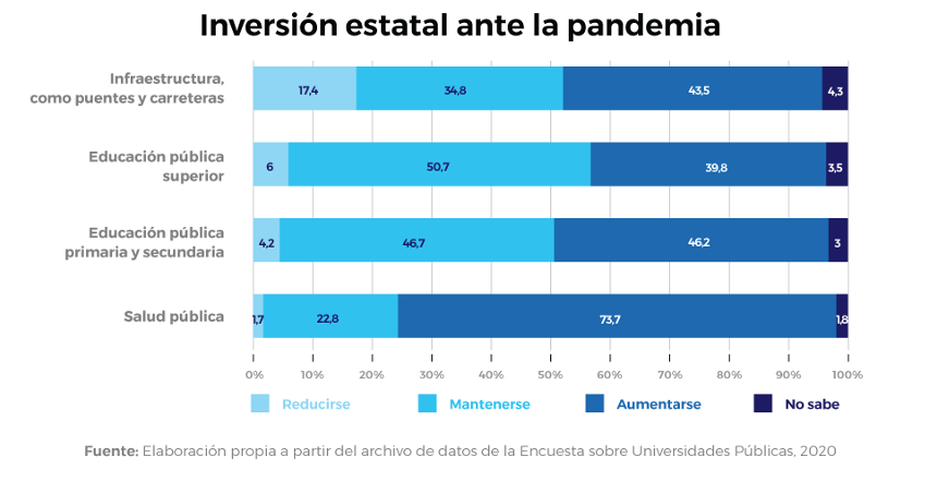 Por último, el 75,1 % de los encuestados consideró que el Estado debe cubrir la mayoría del presupuesto que hace posible el trabajo de las universidades públicas, frente a un 15,7 % de la muestra que manifestó su desacuerdo al respecto.