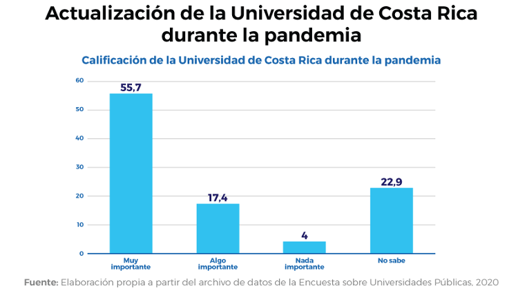 La muestra consultada otorgó un 9,05 a la calidad de la educación que brinda la UCR, cuya presencia en la atención de la actual emergencia sanitaria fue catalogada como “muy importante” por 55,7 % de las personas entrevistadas y como “algo importante” por 17,4 %.