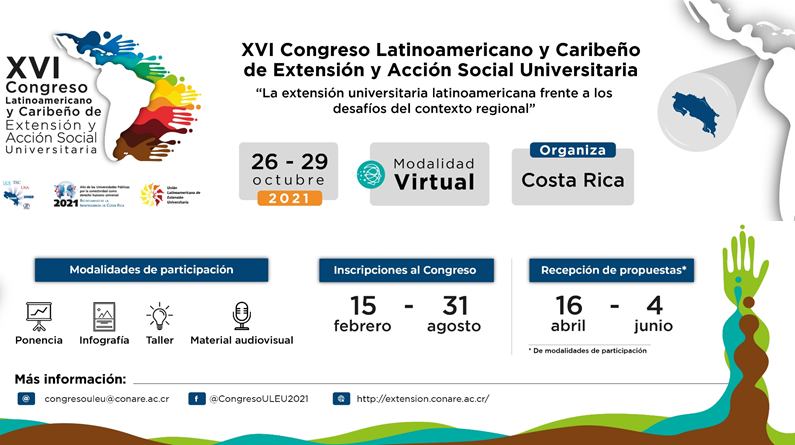 Para más información del XVI Congreso Latinoamericano y Caribeño de Extensión y Acción Social Universitaria puede visitar el sitio web oficial http://extension.conare.ac.cr/ o dirigir su consulta al correo: congresouleu@conare.ac.cr