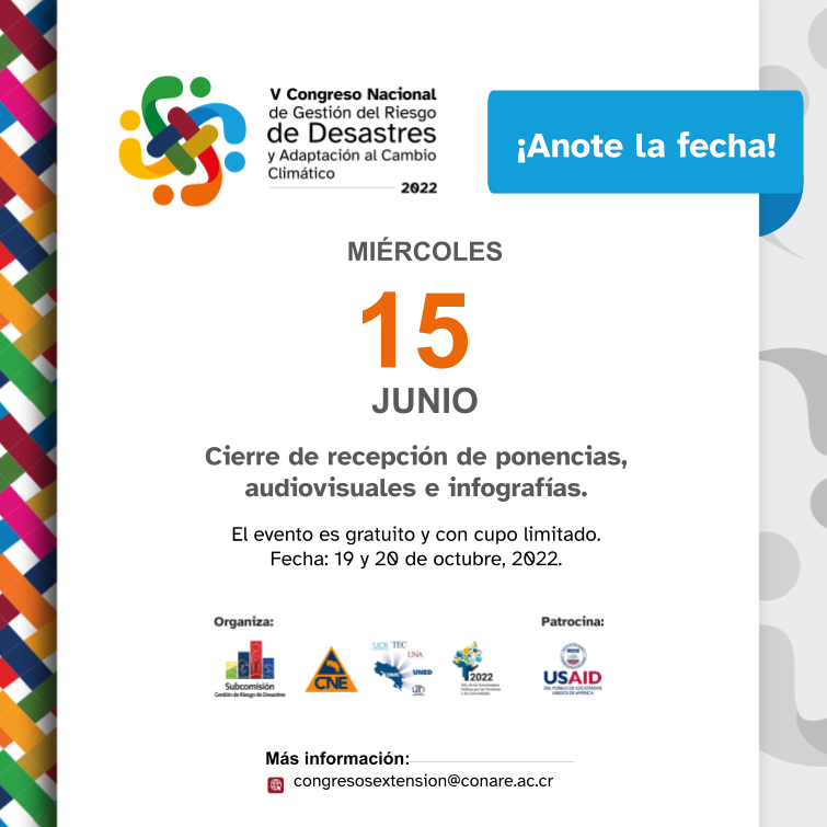 Para más información del V Congreso Nacional de Gestión del Riesgo de Desastres y Adaptación al Cambio Climático puede visitar el sitio web oficial http://extension.conare.ac.cr/congreso2022/ o dirigir su consulta al correo electrónico congresosextension@conare.ac.cr