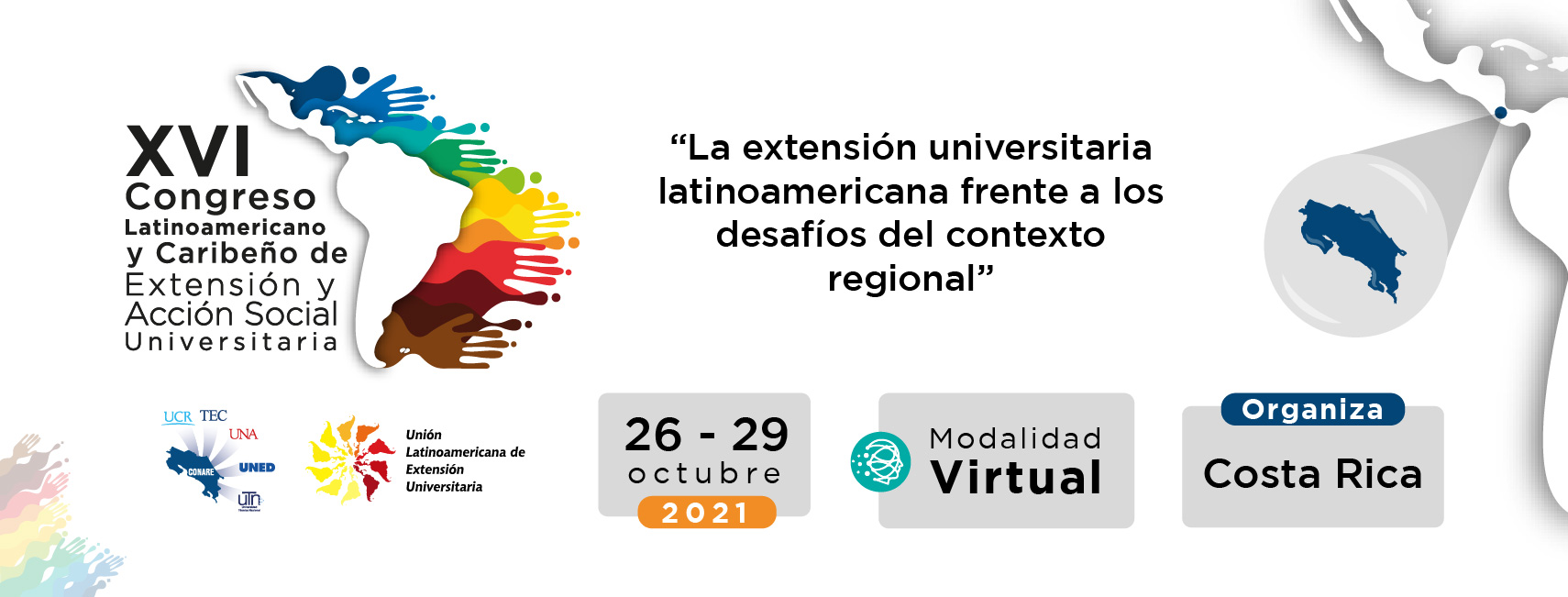 Costa Rica será país anfitrión del XVI Congreso Latinoamericano y Caribeño de Extensión Universitaria, el cual se realizará del 26 al 29 de octubre del 2021 en modalidad virtual. Elevento es gratuito y con cupo limitado. La inscripción para participar será del 15 de febrero al 31 de agosto del 2021. La recepción de resúmenes de ponencias, propuestas de talleres, infografías y material audiovisual (podcast o videos) será del 1 de marzo al 15 de abril del 2021.