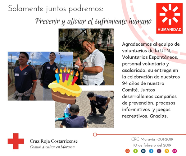 Es así como 40 estudiantes del Programa Centro de Servicios Bilingües del Programa Empléate de la Dirección de Extensión y Acción Social de la Sede Central, realizaron su voluntariado mediante la Benemérita Cruz Roja Costarricense en el Comité de Moravia, comunidad en la cual el sábado 9 y domingo 10 de marzo se realizaron actividades de integración comunitaria; las cuales permitieron celebrar los 94 años de fundación del Comité.