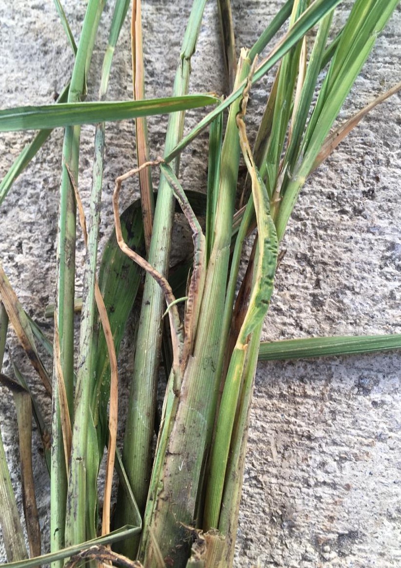 La muerte de plantas recién germinadas es notoria y las que sobreviven muestran deformación de hojas y tallos. Además, se acelera la emergencia de macollas (raquíticas y deformes) y el anclaje de la planta al suelo se debilita por causa de que las raíces se engrosan y elevan la planta a la superficie del suelo.