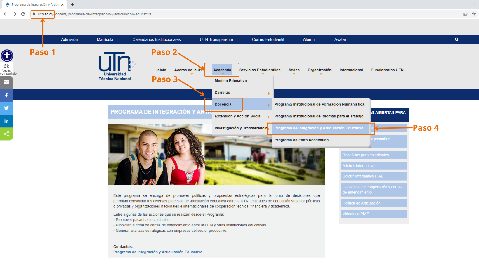 Para conocer más sobre las posibilidades de pasantías, el PIAE publica de forma constante las convocatorias en las redes sociales oficiales de la UTN. Adicionalmente, las convocatorias vigentes también pueden encontrarse en la página web del programa, a la cual se puede acceder siguiendo las siguientes instrucciones: www.utn.ac.cr/ academia/ docencia/ programa de integración y articulación educativa/ pasantías disponibles.