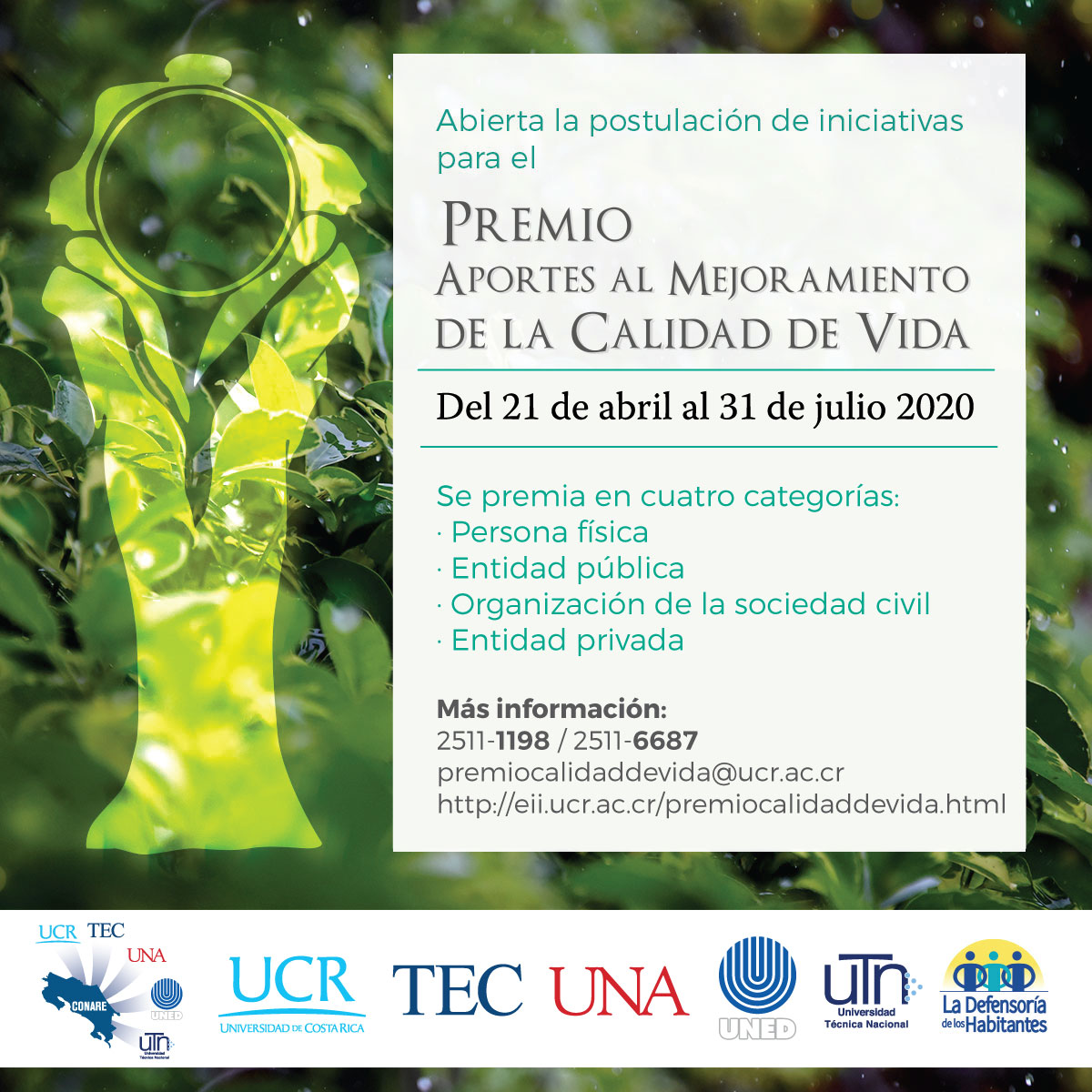 El Consejo Nacional de Rectores (CONARE), en conjunto con las cinco universidades públicas del país y la Defensoría de los Habitantes, abrieron la convocatoria para la postulación de iniciativas para el premio Aportes al Mejoramiento de la Calidad de Vida, el cual reconoce cada año distintos proyectos de acción social que hayan impactado positivamente a la población costarricense.