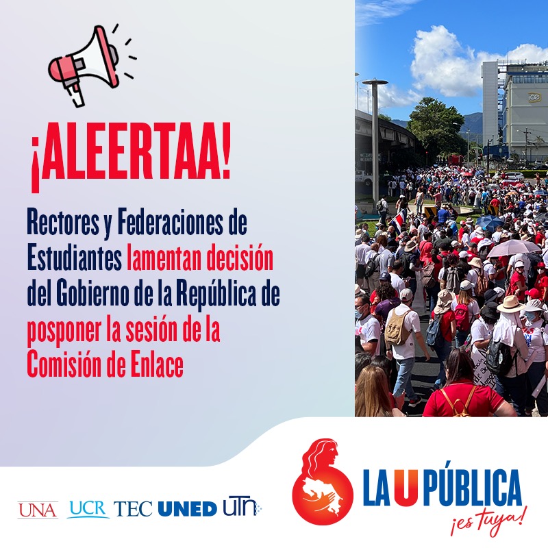 El Consejo Nacional de Rectores y la Confederación Estudiantil Universitaria lamentaron la decisión de la Ministra de Educación Pública de suspender la cuarta reunión de la Comisión de Enlace, acordada para el día de ayer a las 2:30 p.m. en las instalaciones del Consejo Nacional de Rectores, para continuar la negociación del Fondo Especial para la Educación Superior (FEES) 2023.