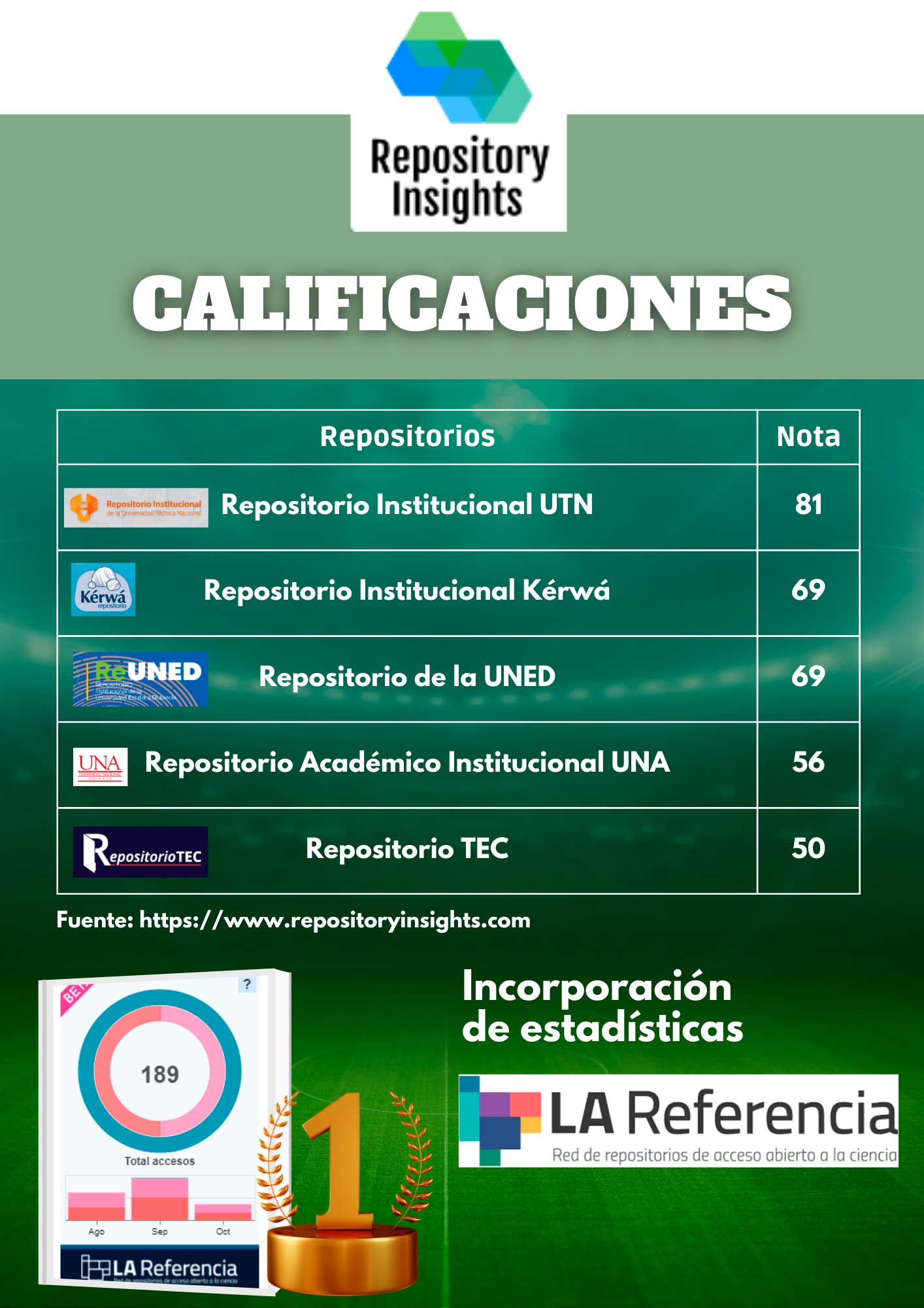 El Repositorio Institucional de la UTN obtuvo la nota de 81, lo que lo convierte en el repositorio mejor evaluado de Costa Rica, puesto que el Repositorio Kerwa de la UCR y el de la UNED obtuvieron la nota de 69; la UNA, 56 y el TEC, 50.