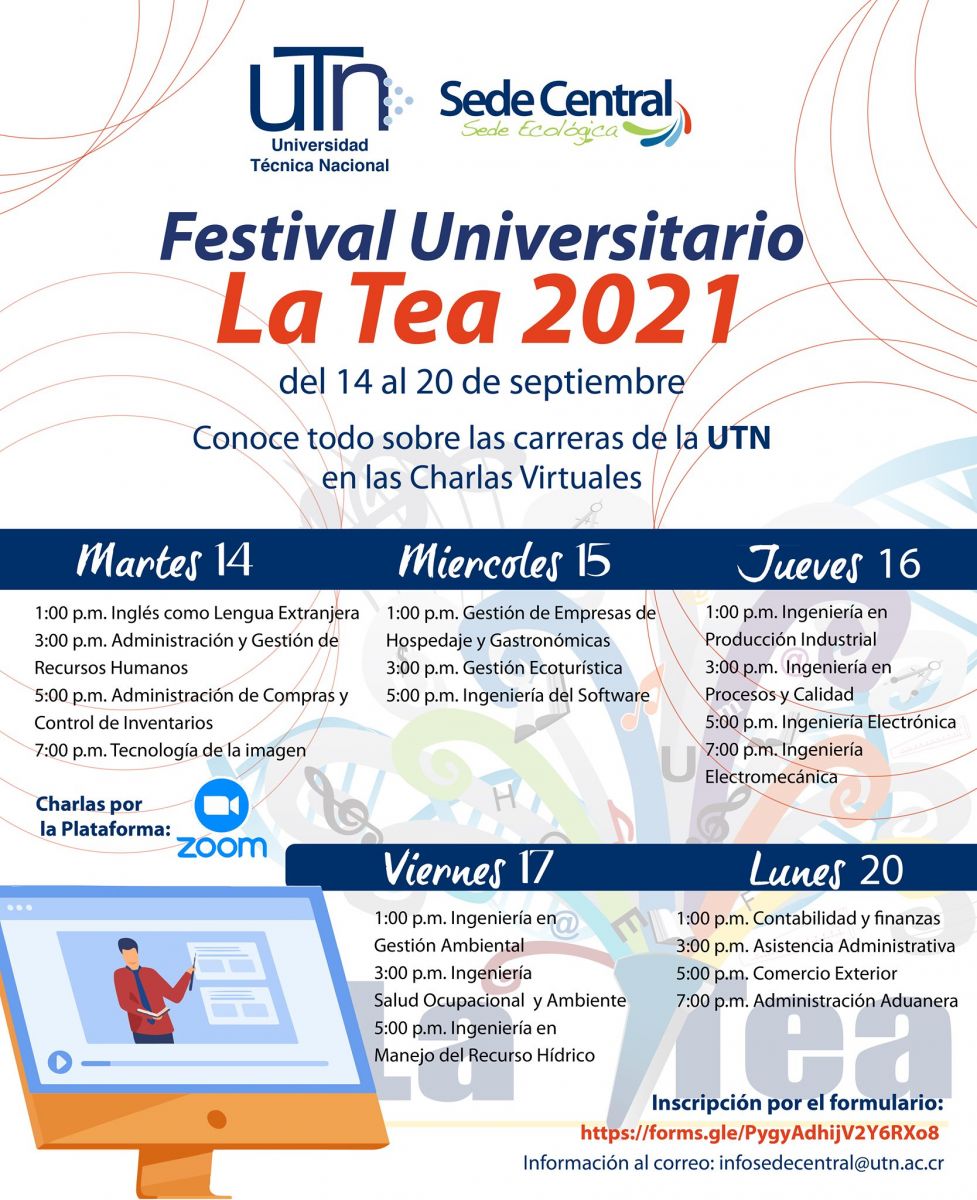 Del 14 al 20 de setiembre, la Sede Central informará de sus Carreras mediante el Festival Universitario La Tea que, en esta ocasión, se programó en forma virtual, con el fin de constituirse en un espacio académico y cultural dirigido a estudiantes que cursan el XI y XII año de Educación Secundaria para que conozcan las ofertas académicas y el procedimiento de admisión para el 2022, el cual finaliza el 29 de setiembre.