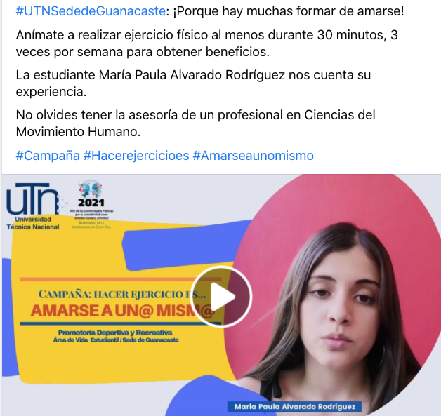 La Promotoría Deportiva y Recreativa del Área de Vida Estudiantil la Sede de Guanacaste promovió la campaña: “Hacer ejercicio es amarse a uno mismo” que se realizó con el objetivo de motivar a la comunidad universitaria a iniciar un cambio con su estilo de vida realizando ejercicio físico.