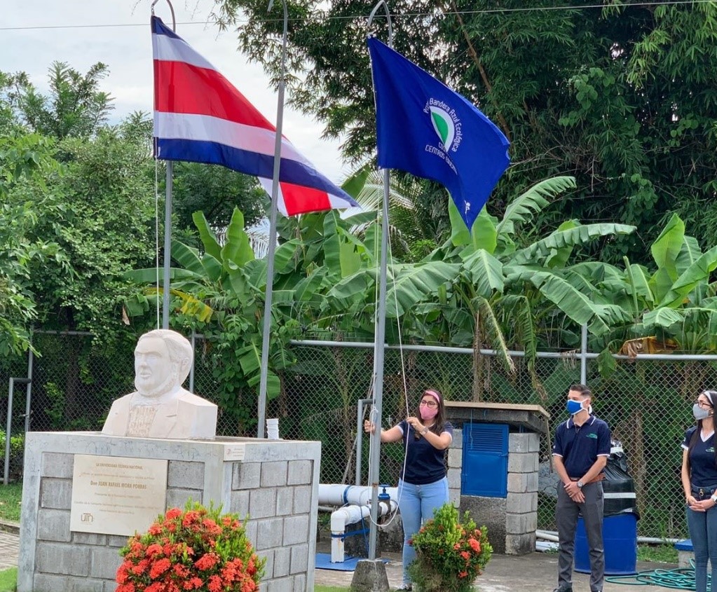 El jueves 02 de julio, una representación de funcionarios de la UTN y estudiantes estuvieron presentes en un pequeño acto, con todas las medidas que el Ministerio de Salud exige, con el objetivo de izar la Bandera Azul Ecológica que fue otorgada al Campus Juan Rafael Mora Porras en el recinto de la UTN en El Roble.