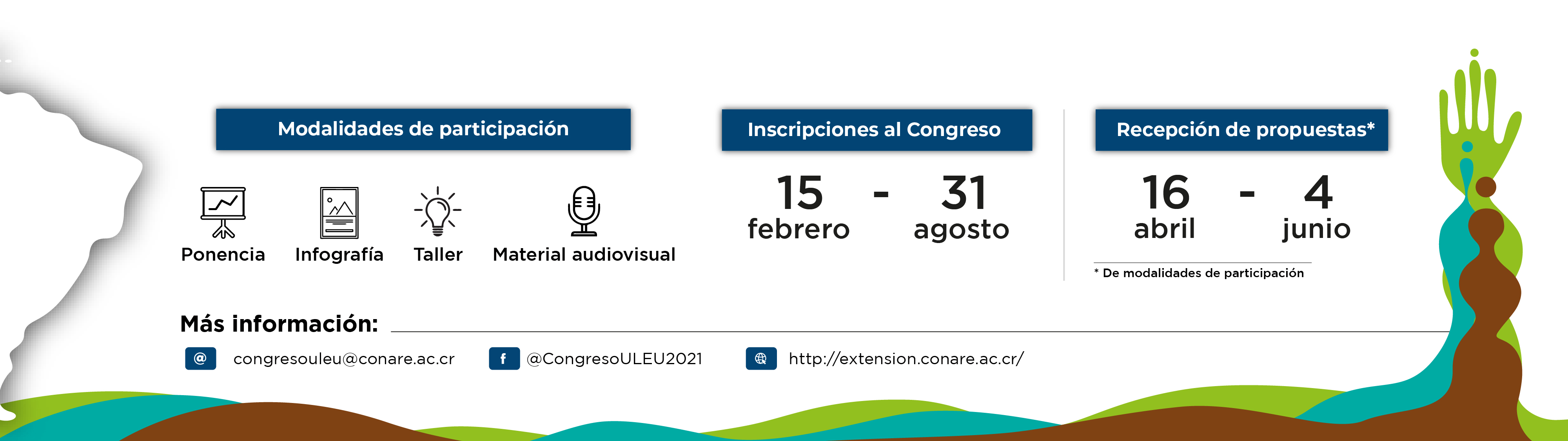 Para más información del XVI Congreso Latinoamericano y Caribeño de Extensión y Acción Social Universitaria puede visitar el sitio web oficial http://extension.conare.ac.cr/ o dirigir su consulta al correo: congresouleu@conare.ac.cr.