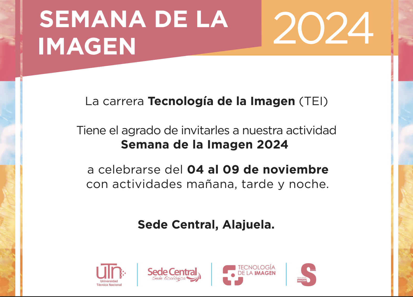 La Semana de la Imagen (SI), es un proyecto del Plan Anual Operativo de la Carrera Tecnología de la Imagen de la Universidad Técnica Nacional. Este año en su undécima edición vuelve con una programación completa de 17 actividades desde el lunes 04 hasta el sábado 09 de noviembre, mañana, tarde y noche.