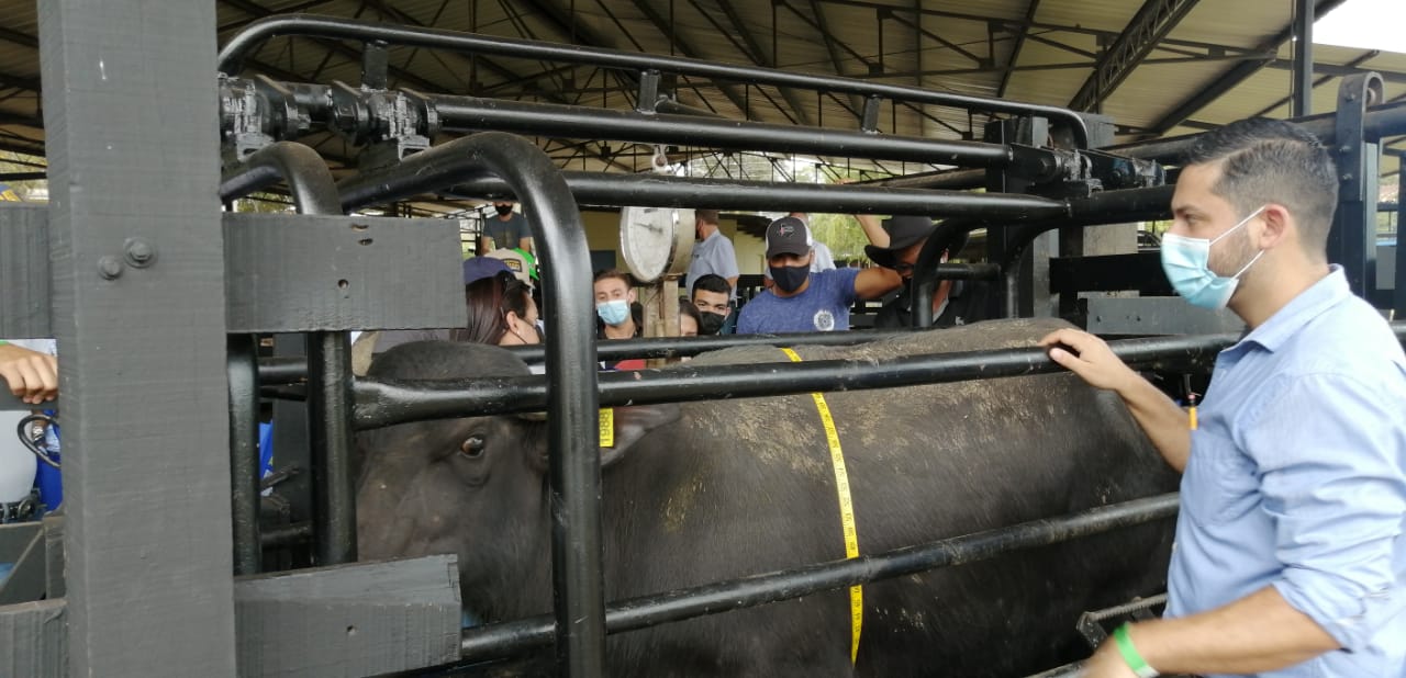 Una vez finalizada la charla, se dividió al grupo para que visitaran tres estaciones de campo demostrativas: la primera trató de una práctica de cálculo de peso de búfalas con uso de cinta, a cargo del Dr. Josué Rivera, Director de la carrera de Medicina Veterinaria con Énfasis en Buiatría.