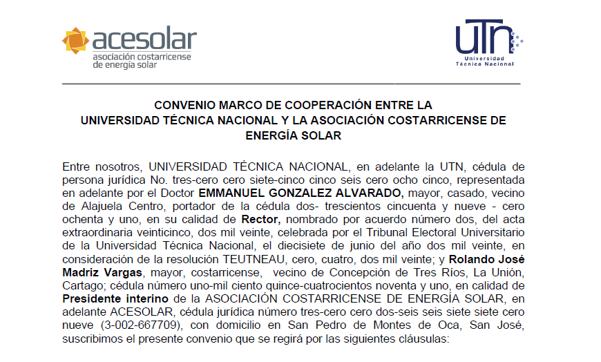 La Universidad Técnica Nacional (UTN) y la Asociación Costarricense de Energía Solar (ACESOLAR) suscribieron un convenio marco de cooperación.