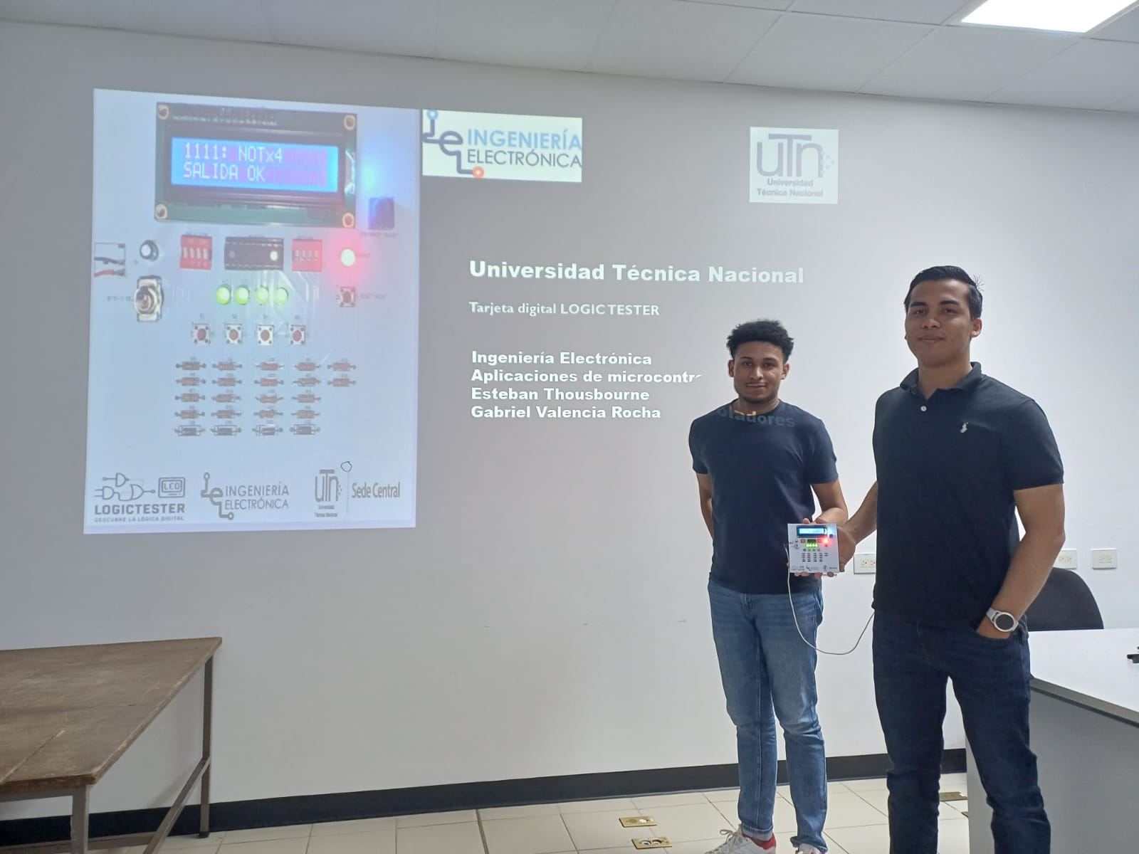 Los estudiantes Esteban Thousbourne y Moisés Valencia diseñaron la “Placa Educativa Logic Tester” en el marco del curso de Microcontroladores, dirigido por el profesor Ing. Esteban Rojas, durante el II cuatrimestre de 2025.
