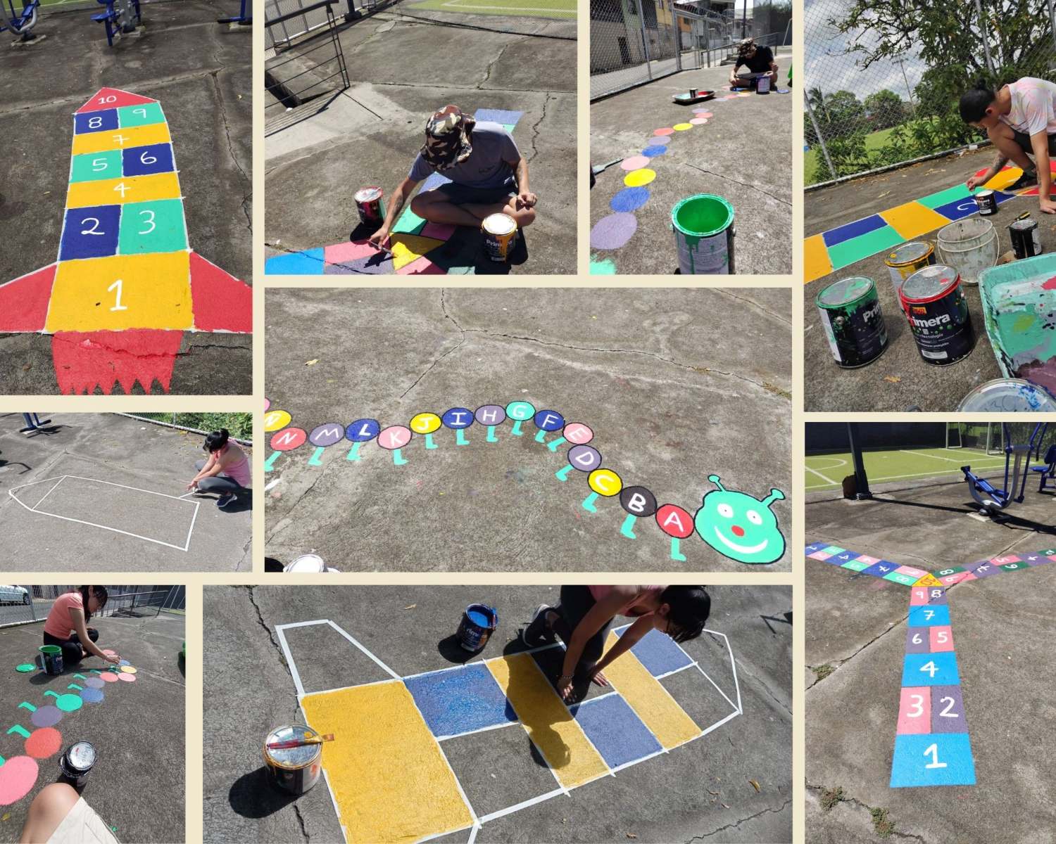Como parte del proyecto se realizaron varios juegos recreativos, tales como el tradicional juego a la rayuela y un gusanito con las letras del abecedario, para incentivar a los niños de la comunidad en la importancia de practicar diferentes actividades al aire libre y a su vez lograr apropiarse del espacio para la convivencia sana en la comunidad y la promoción de la identidad local.