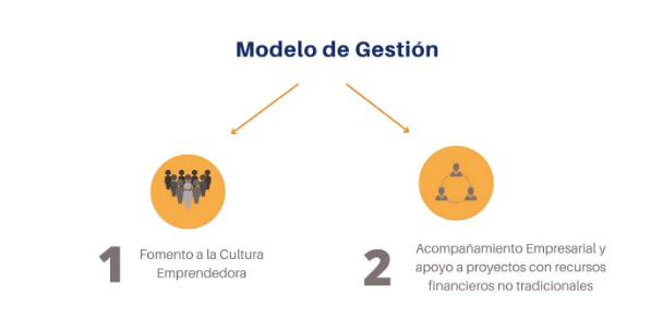 El modelo de gestión se establece en dos grandes ejes, el primero está enfocado a la realización de todas aquellas actividades que promueven la cultura emprendedora y que se constituye en la línea base para la generación de ideas de negocios, el segundo rubro está dirigido al acompañamiento en la gestión y desarrollo empresarial y el apoyo a proyectos con recursos financieros no tradicionales, o bien de forma conjunta.