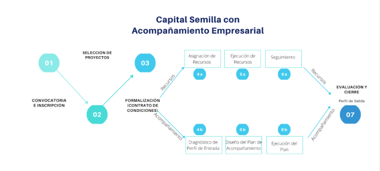 La siguiente imagen muestra cómo se desarrollarán las actividades de la segunda etapa, en donde el participante puede recibir la asesoría en la gestión de su idea de negocio o empresa, que contempla el diagnóstico y la implementación del plan de acompañamiento, así como procesos de capacitación; adicionalmente el emprendedor puede concursar por recursos de capital semilla, o bien optar solo por uno de los servicios ofrecidos.