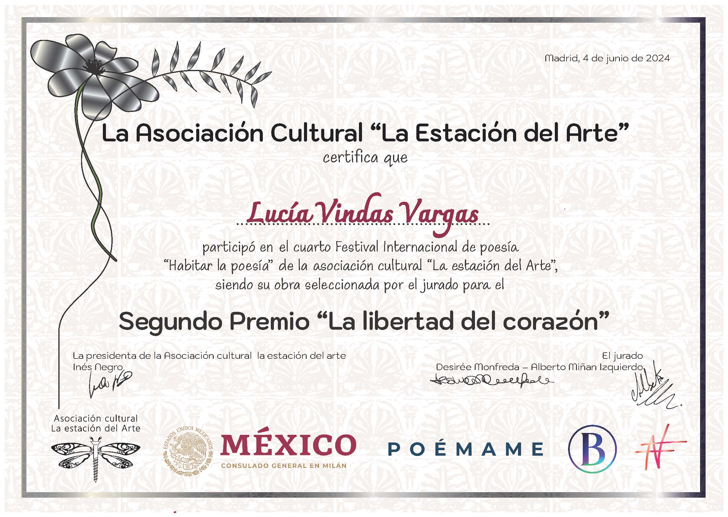 Lucía Vindas, funcionaria de la Carrera de Contabilidad y Finanzas y de la Carrera de Comercio Exterior de la Sede Central obtuvo el segundo lugar del concurso “Festival Internacional de Poesía La Estación del Arte” organizado por la Asociación Cultural La Estación del Arte de Madrid, España, en conjunto con el Consulado de México en Italia.