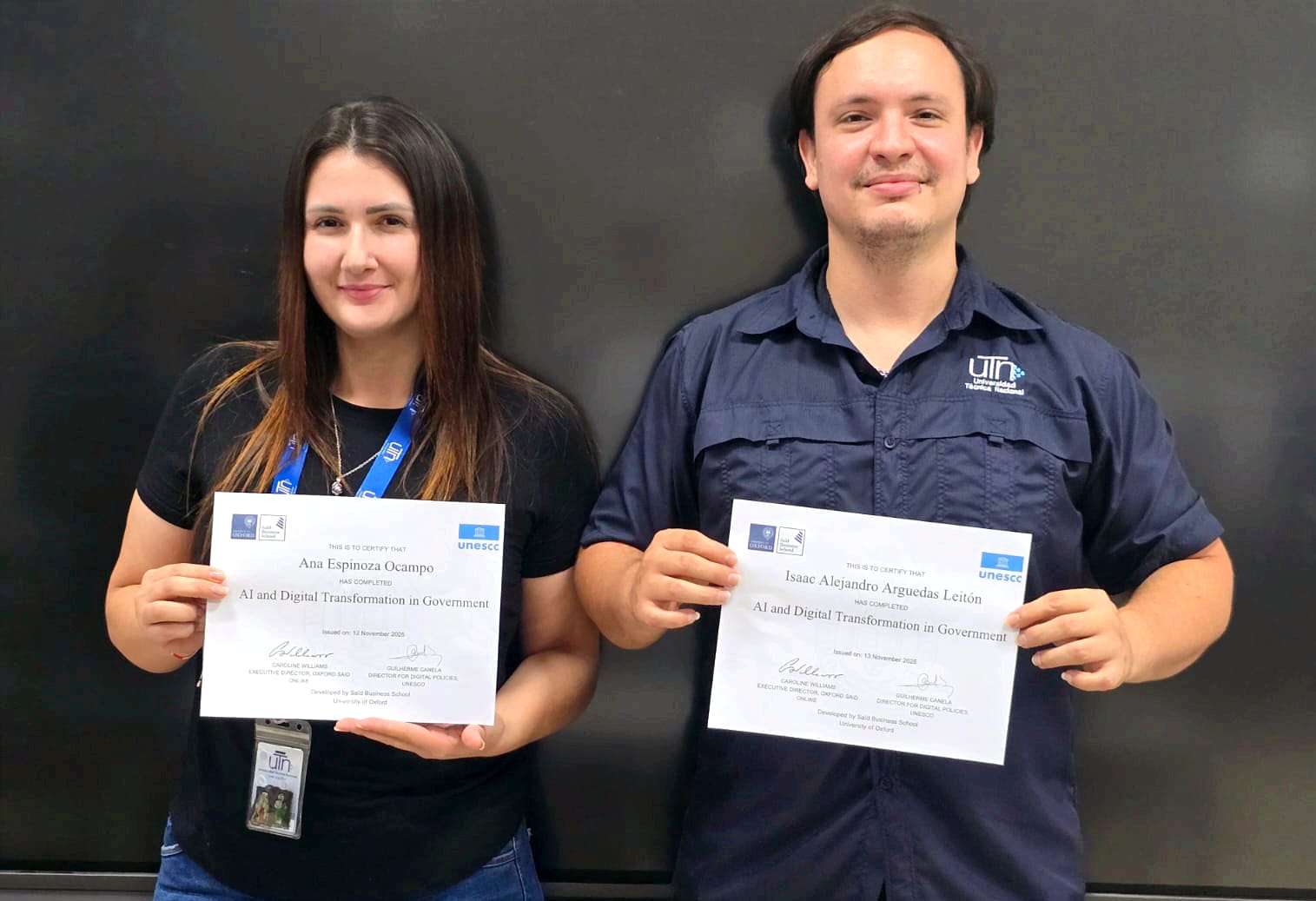 Ana Gabriela Espinoza Ocampo e Isaac Arguedas Leitón, funcionarios del Área de Extensión y Acción Social de la Sede del Pacífico de la Universidad Técnica Nacional (UTN), concluyeron exitosamente el curso internacional “AI and Digital Transformation in Government”, impartido por la Universidad de Oxford en alianza con la UNESCO y la SPAARK-AI Alliance.