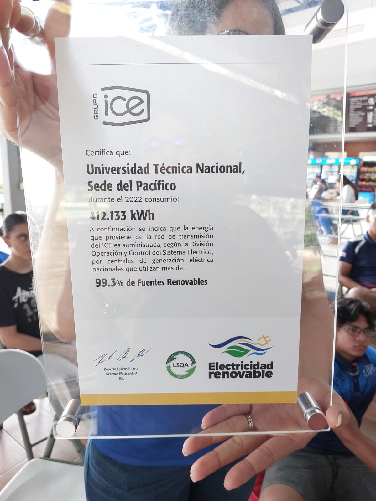 Flory Medina, Ejecutiva de Cuenta Empresarial de la Sucursal del ICE en Puntarenas, se presentó en las instalaciones del Campus Juan Rafael Mora Porras a entregar este certificado. “El galardón hace constar que la electricidad consumida es generada con fuentes renovables de la matriz nacional, lo que se convierte en una ventaja para las metas de sostenibilidad de las organizaciones” manifestó.
