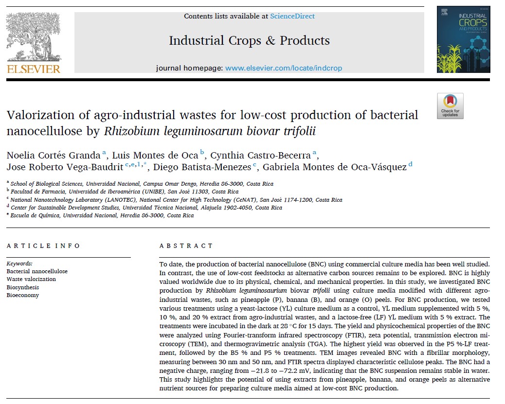 El Centro de Estudios sobre Desarrollo Sostenible (CEDS) de la Universidad Técnica Nacional (UTN) comparte con la comunidad universitaria la reciente publicación del artículo científico “Valorization of agro-industrial wastes for low-cost production of bacterial nanocellulose by Rhizobium leguminosarum biovar trifolii”, en la revista internacional Industrial Crops and Products.