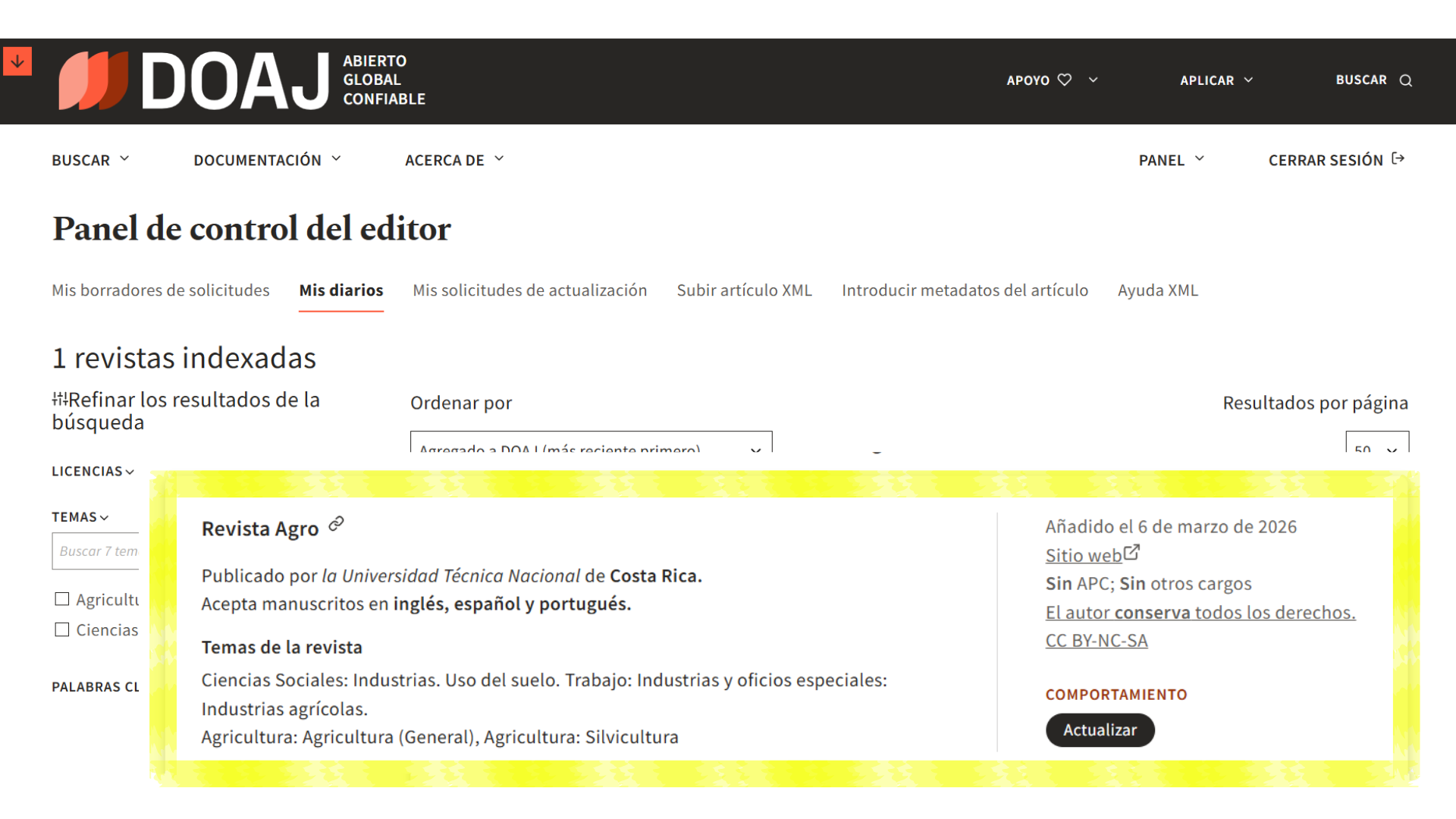 La Revista Agro de la Universidad Técnica Nacional (UTN), Sede de Atenas, alcanzó recientemente un hito clave en su consolidación editorial al lograr su indexación en el catálogo de Latindex y en el Directory of Open Access Journals (DOAJ), dos de los sistemas internacionales más reconocidos que reúnen publicaciones científicas que cumplen estrictos estándares de calidad.