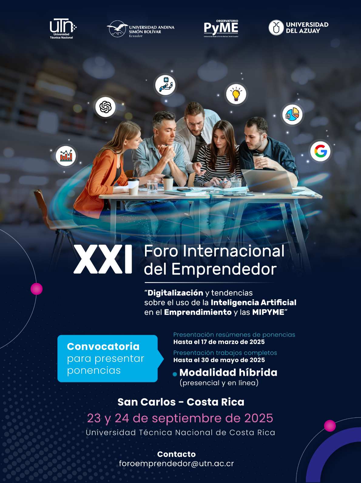 Ciudad Quesada, lunes 3 de febrero 2025. La Universidad Técnica Nacional, en su sede de San Carlos, el Observatorio de la PyME de la Universidad Andina Simón Bolívar, Sede Ecuador y la Universidad del Azuay de Ecuador organizan el "XXI Foro Internacional del Emprendedor: Digitalización y Tendencias sobre el Uso de la Inteligencia Artificial en el Emprendimiento y las MIPYME".