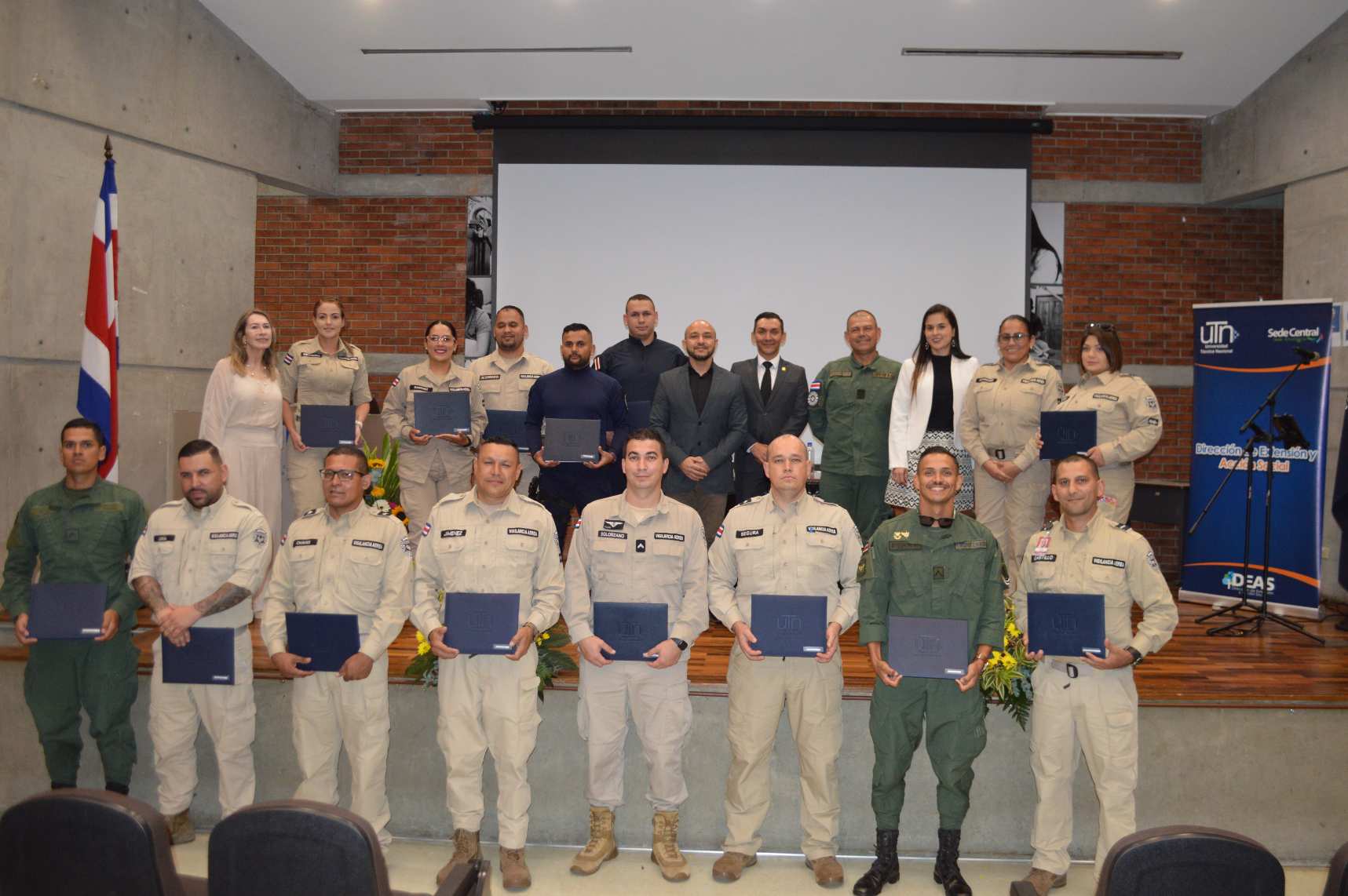El evento de entrega de títulos contó con la presencia destacada del señor Jorge Madrigal González, Comisionado Jefe de Inteligencia y Análisis Criminal del Ministerio de Seguridad Pública; el señor Adrián Salazar Cascante, Director de Frontera; la señora María Rodríguez Ramírez, Jefa del Aeropuerto Internacional Juan Santamaría; y el señor José Soto Morera, Decano de la Sede Central.