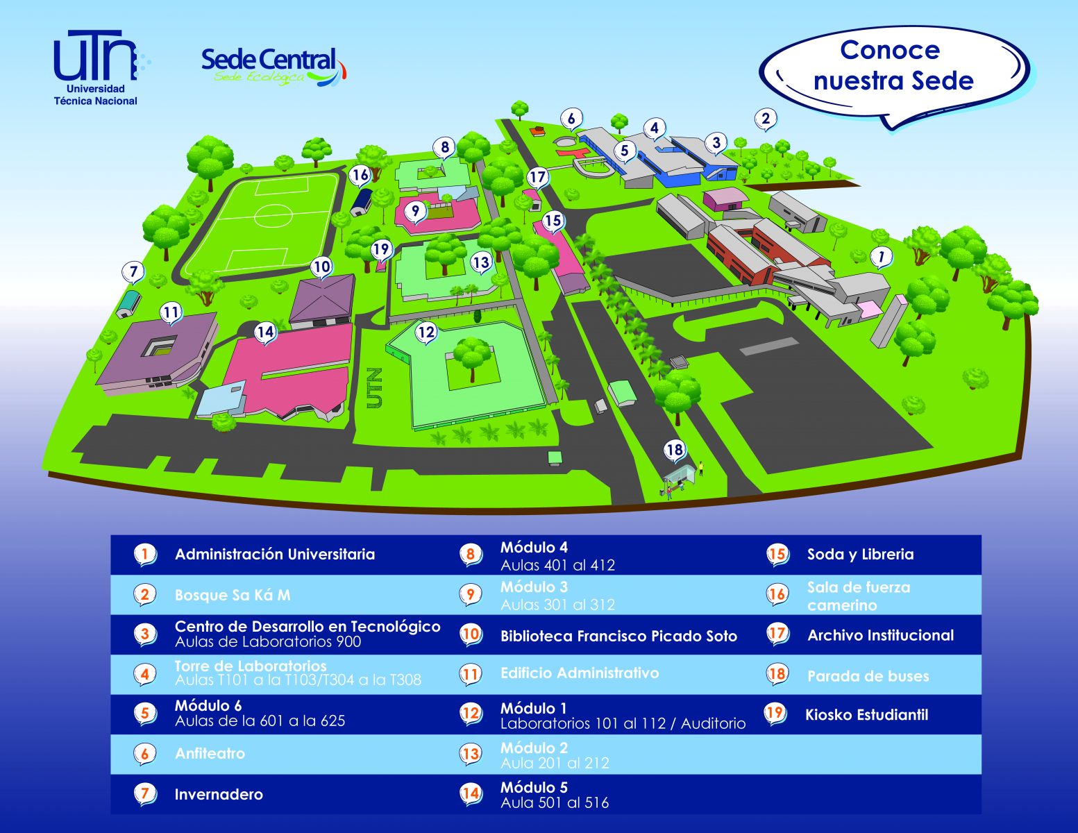 La Sede Central de la UTN, ubicada en Villa Bonita de Alajuela, se extiende sobre un campus de 7.5 hectáreas donde se desarrollan las principales actividades académicas y administrativas. En sus instalaciones se encuentran oficinas fundamentales como el Consejo de Sede, Decanato, Dirección de Investigación, Dirección de Extensión y Acción Social, Área de Gestión Administrativa, Mercadeo, Biblioteca, Vida Estudiantil, Tesorería y Servicios Operativos.