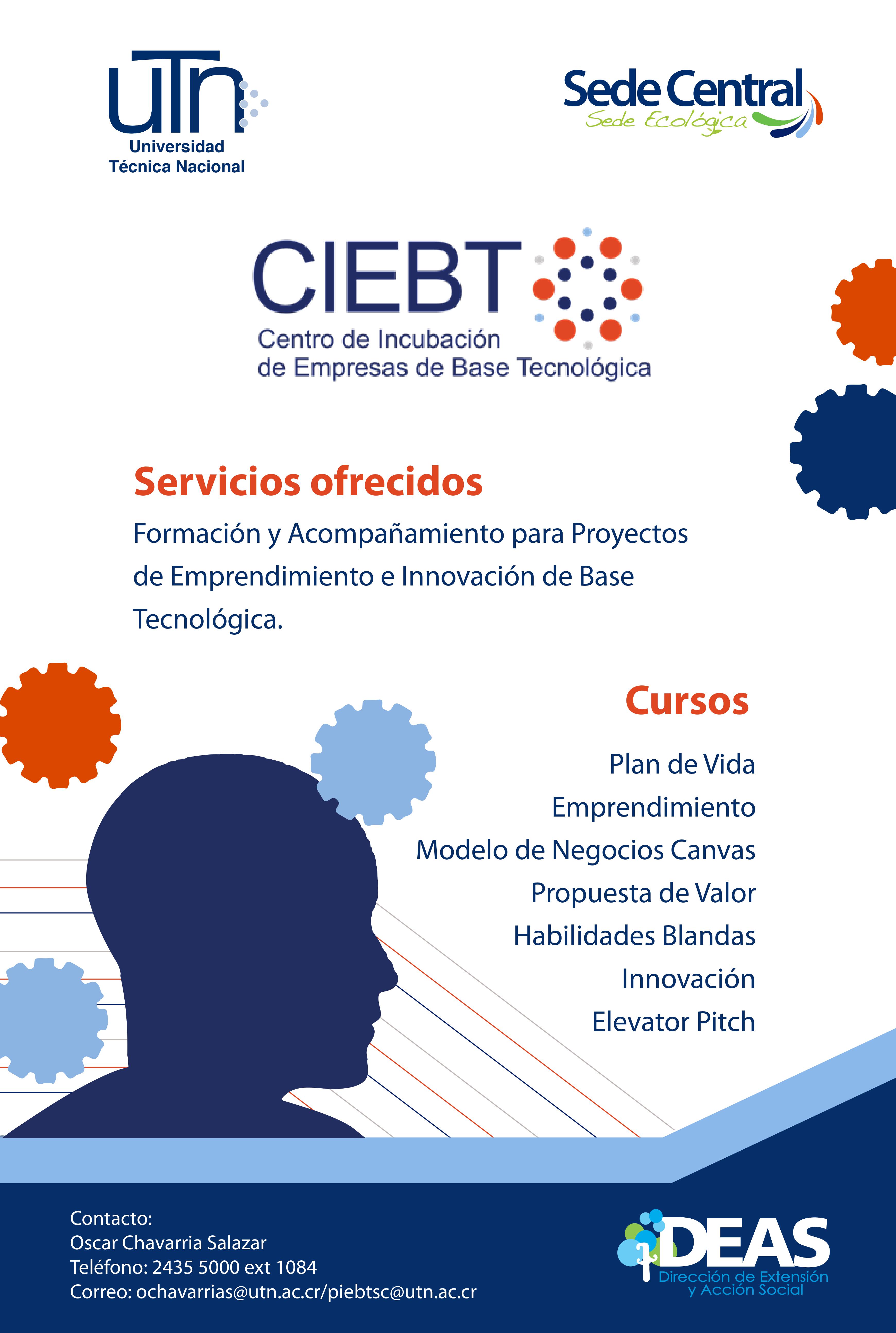 Centro de Incubación de Empresas de Base Tecnológica, Sede Central: correos: ochavarrias@utn.ac.cr ; piebtsc@utn.ac.cr. Teléfono: 2435-5000. Ext. 1084