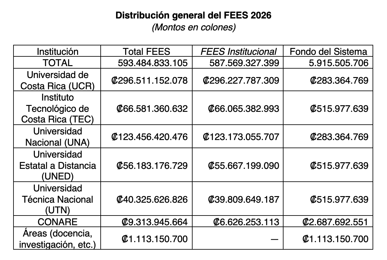 El pasado 2 de setiembre, el Consejo Nacional de Rectores (CONARE) alcanzó un consenso unánime sobre la distribución del Fondo Especial para la Educación Superior (FEES) correspondiente al año 2026. Este acuerdo representa un paso importante para asegurar el funcionamiento y la sostenibilidad de las cinco universidades públicas de nuestro país.