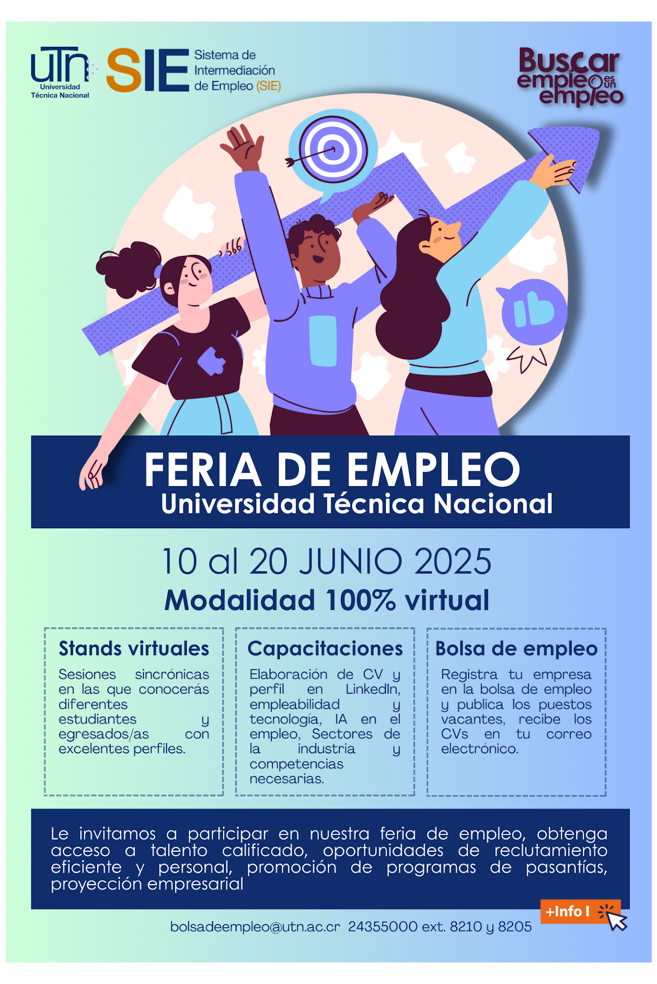Del 10 al 20 de junio, la Universidad Técnica Nacional estará realizando la Feria de Empleo Virtual bajo el lema: “buscar empleo es un empleo”.